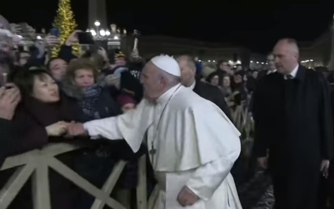 Spre mirarea celor din jur, papa s-a zbătut ca să scape din strânsoare. Vizibil înfuriat de gestul femeii, a lovit-o de două ori peste mână, înainte să reușească, în sfârșit, să evadeze. Negru de supărare câteva clipe, și-a recăpătat apoi zâmbetul și s-a îndepărtat de mulțime.