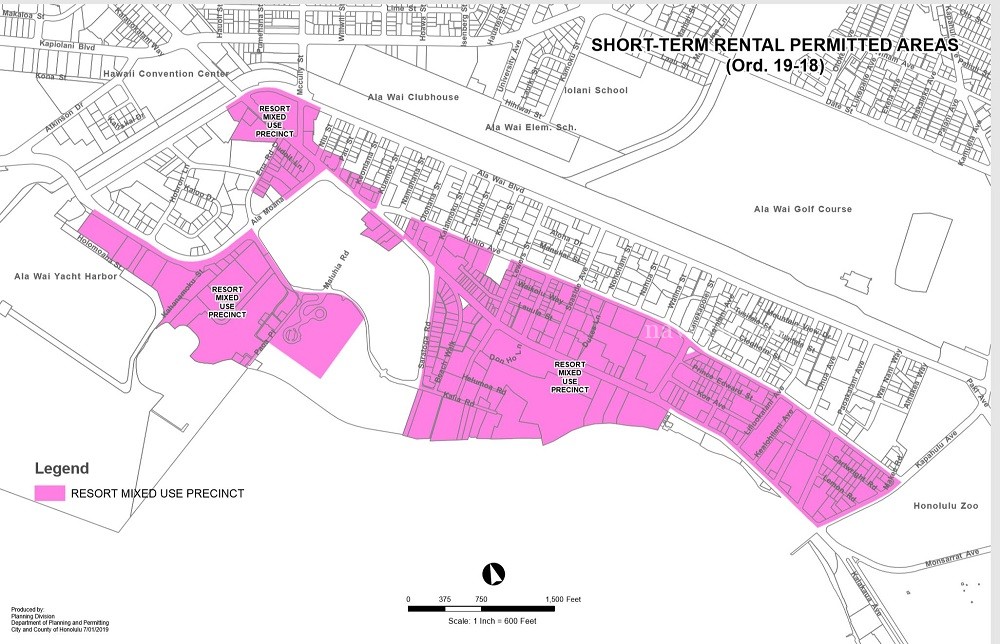 3の「リゾートエリアと呼ばれる指定された場所」という元々短期貸しが許可されているエリアは、主にクヒオ通りから海側のエリアで、下図のピンク色に塗られた部分。
