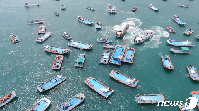 | 어업행사권 갈등을 겪고 있는 해남과 진도 어민들이 10일 각각 어선 240척과 150척을 동원해 마로해역에서 대치했다.(독자제공)2020.9.10/뉴스1 © News1 |