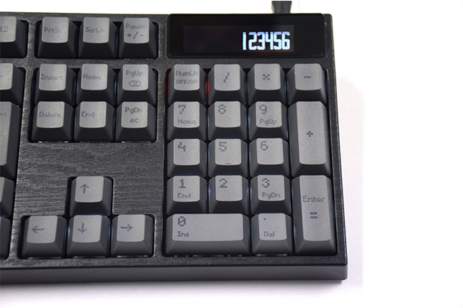 落ち着いた黒とグレーの色調ながらもパネルは木目調、そしてキーキャップは電卓風のデジタルなフォントという点もこだわりが見られます。