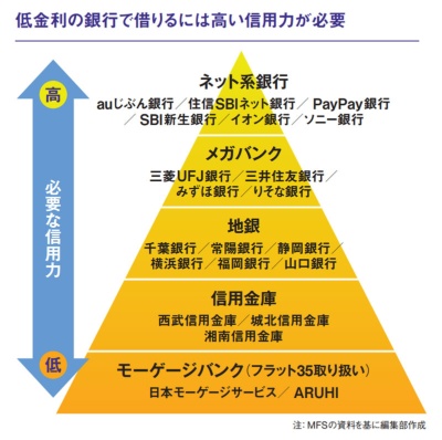 金融機関の種類と必要な信用力は、上図のようなピラミッド構造になっている。ピラミッドの上に行けば行くほど金利は低くなる傾向にある。