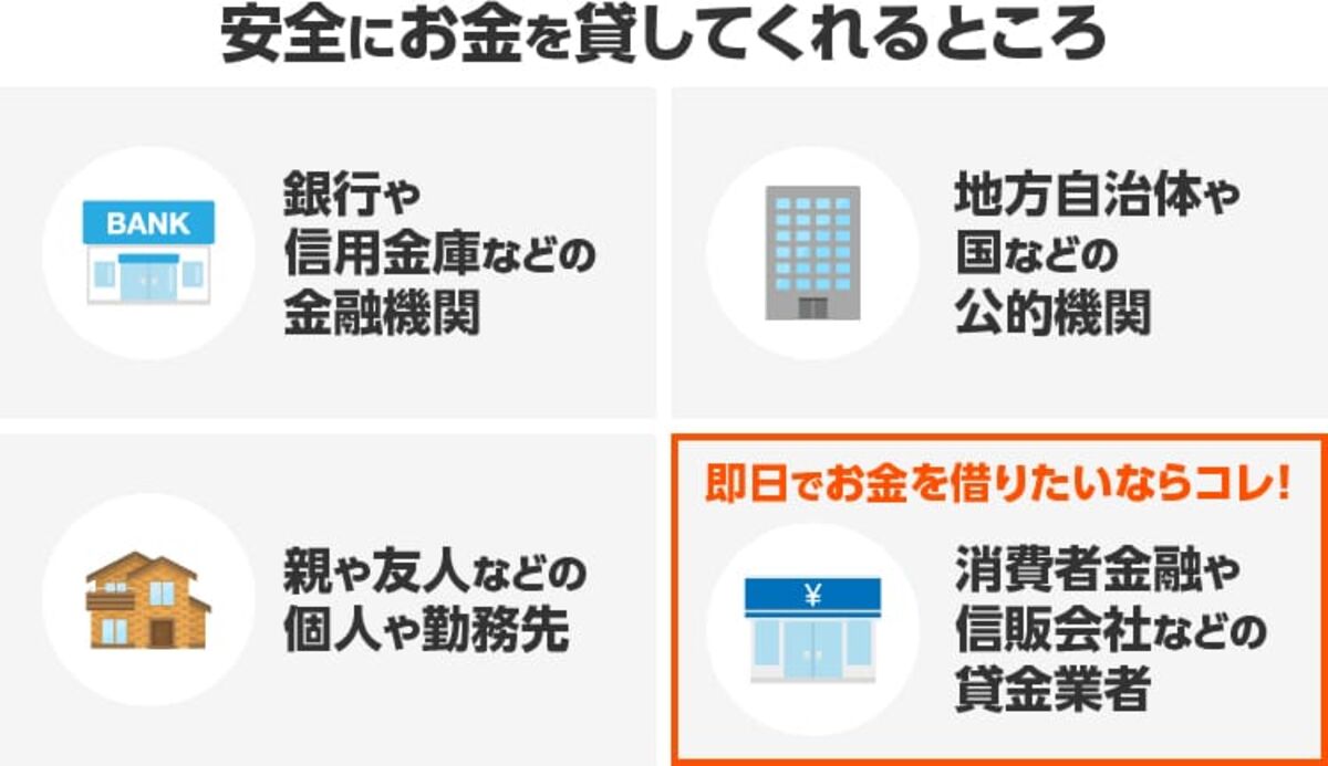 安全にお金を貸してくれるところは、主に次の4つです。